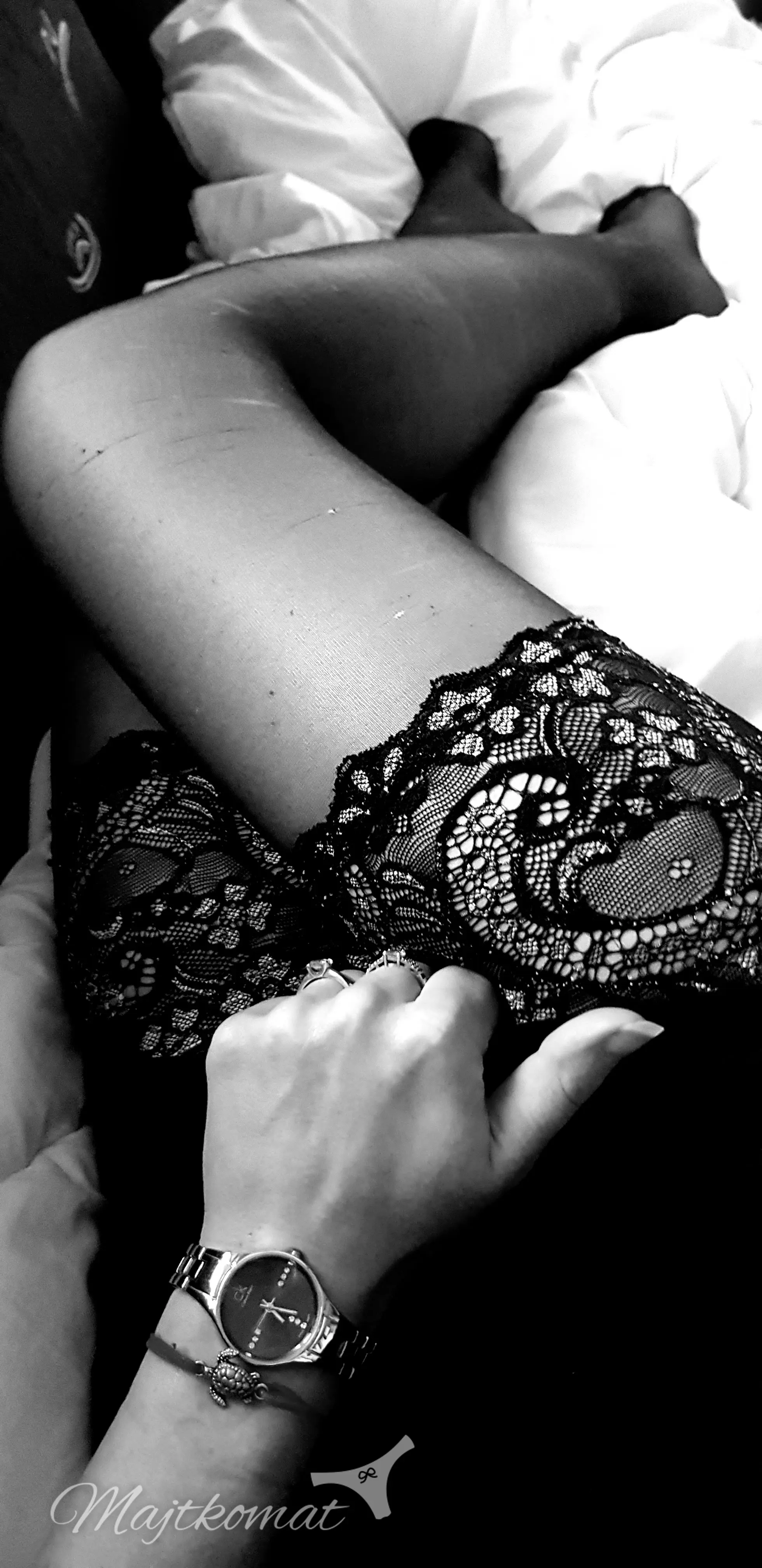 Koronkowy, biały komplet z pończochami samonośnymi. Noszone tylko i wyłącznie w skórzanych szpilkach